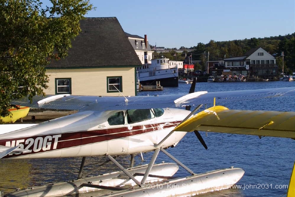 N1550C Tom Dunn's 1953 180, CN 30250, tied up and waiting for action at 52B, Greenville Seaplane Base, Greenville, ME. Photos are from the 9/03 and 9/06 International Seaplane Fly-in. #2 and 3# are the Bush Pilot Canoe Race where one guy paddles the canoe out to the floating dock. The pilot waits until he's almost there, fires up, races out to the dock and shuts down. They tie the canoe on together and race back to shore. |