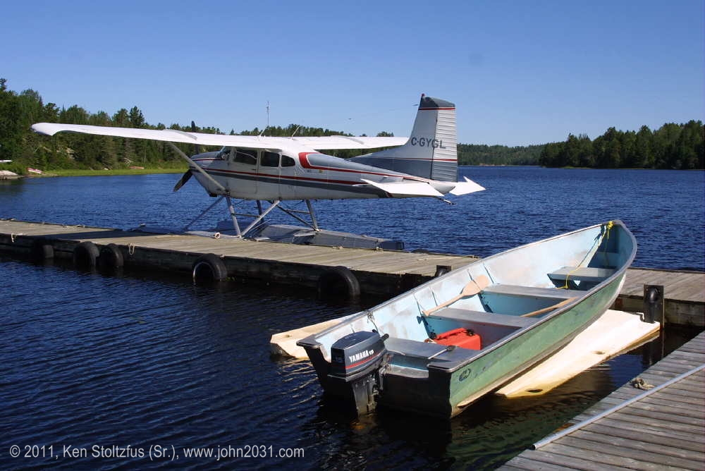 Cessna 185 C-GYGL, at Nestor Falls Fly-In, Canada, 7-05, and 2, sharing the dock with a 206. |