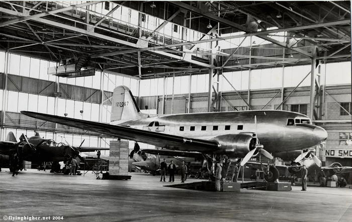 Wow, what a shot! I'd love to have a library full of photos like this. There is a Northrop P-61 Black Widow under maintenance on the left; I believe a Dauntless SBD under the C-53 tail; a Noorduyn Norseman with its cowling off, to the right of the Dauntless; and a Beechcraft AT-10, 42-2235 under the C-53 nose. It looks like 41-20067 is being leveled, to weigh it. I've done that and it feels like the tail is in the clouds. I was always happy to get it back down.