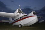 Photo 2 - Not the streamlined, sleek look of some aircraft but certainly the envy of many pilots! The cabin door is well above the water line. It's not the easiest airplane in the world to get in and out of but most of us would cheerfully accept a little inconvenience for the privilege of a ride! Photo 3 - There's something about the exhaust system and cowling there that give it an "old time" look. The P&W R-985's are among the world's most reliable engines. I flew behind them in 450-Stearman and Twin Beech sprayers. Photo 4 - An evening shot. Most of these photos were taken at the 2003 International Seaplane Fly-In, at 52B Greenville Seaplane Base, Greenville, ME, but this one was 2005. The Goose parked up at 3B1, Greenville Municipal, because of lack of space down on the water.