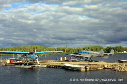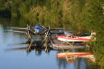 Photo 2 - Reflections. As is so often true in life one may need to take a second look before you see what is really there. I used this photo in my 2006, Preferred Airparts' calendar. Photo 3 - C-FXUO is gone for the moment, 'ZNG waits patiently in the early morning hours. Senior Dock Hand checks things out. I could sit and watch these airplanes come and go all day long! Photo 4 - The Beech has the two-piece windshield, what appears to be a Hamilton nose cap, Hamilton Standard Hydromatic props, and a Beechcraft cargo door. It is joined by Showalters' Cessna 180H C-FAIH for a few minutes. |