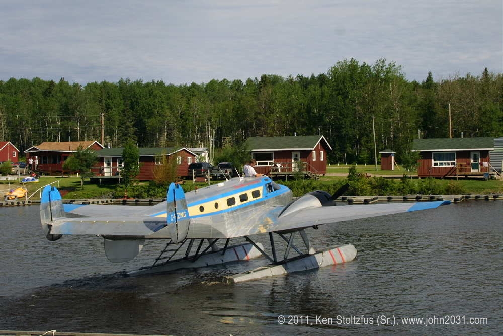 Photo 5 - Fishermen and fisherladies with their stuff. Many of Showalter's customers come back year after year. Photo 6 - Climbing in through the Bristol, cockpit hatch. Note the base for the astrodome which was on the Canadian 3N series aircraft for celestial navigation. Photo 7 - #1 is lit and getting them turned away from the dock. Photo 8 - Showalter's Fly-In Service. Learn more about them at www.fishshowalters.com. They have added a Beaver to their fleet and you can see a video of their aircraft on their site. As of 1/25/11 this Beech is still registered to Showalters. |