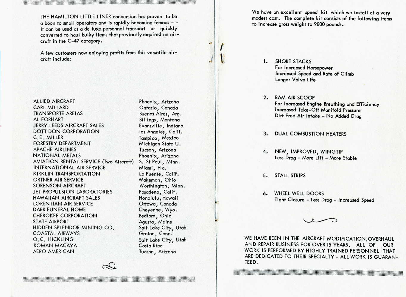 This is a later Hamilton Aircraft "Little Liner" brochure with their #10,200 gross weight kit, probably 1960. In this one the model aircraft is N9572Z, a USAF C-45G 51-11468, cn AF-25. In 1963 it was registered to Mark Todd of Inglewood, CA, as N7196C, and it shows the "Inspection Date" as April 1960. I didn't look up subsequent owners but it now appears in the FAA register as "Sale Reported." |