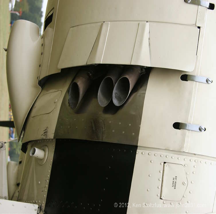 Well, where do I start, in talking about this one? "Wow - - spectacular!" and a contribution to any lineup! Here's the "short stacks" on the right side, for four or five of the nine cylinders. Seven Mike Hotel is pretty from any angle! This is where the JATO (Jet Assisted Take Off) bottle outlet was, on the back of the nacelle. |