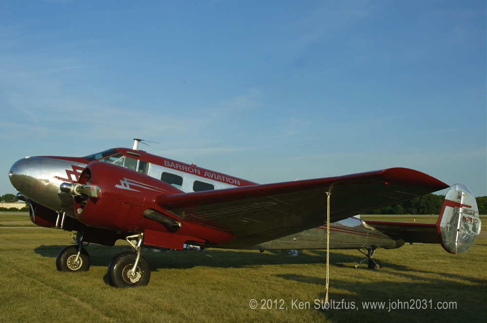 I saw this Twin Beech jump ship at the annual Fall Fly-In at Red Stewart Airfield. It looks very stock except for the Hamilton nose and outside air scoops. Okay, now we can see the square wing tips, cowl louvers, raised stabilizer and high tail gear. It could be as high as #9465 gross, up from the original #8750.