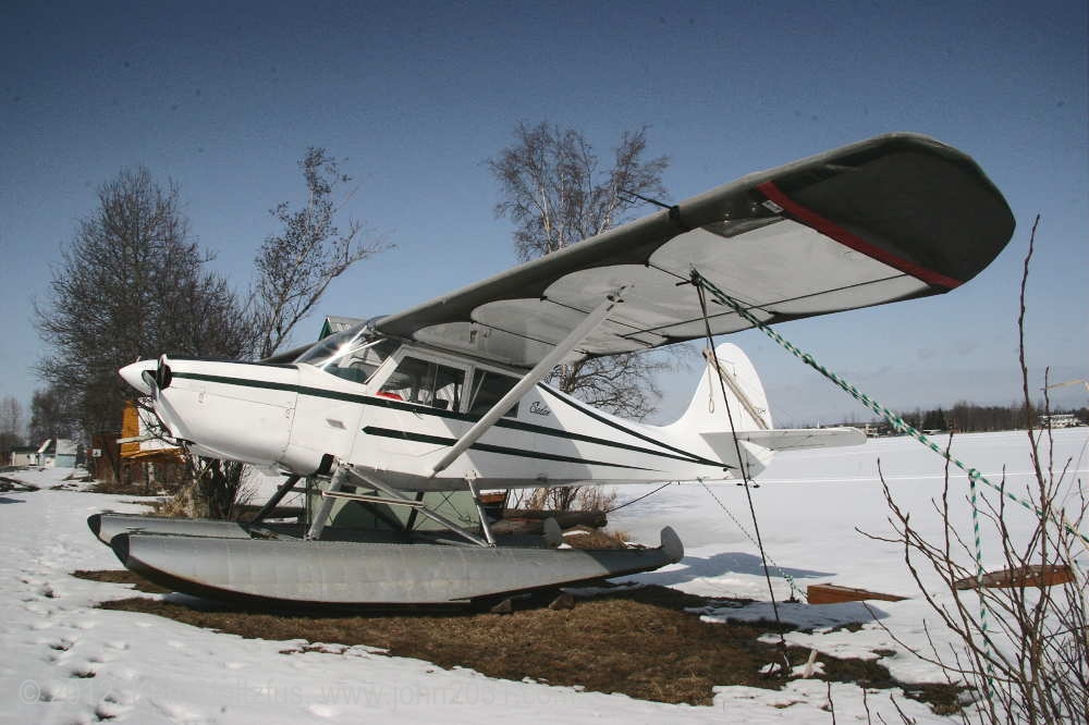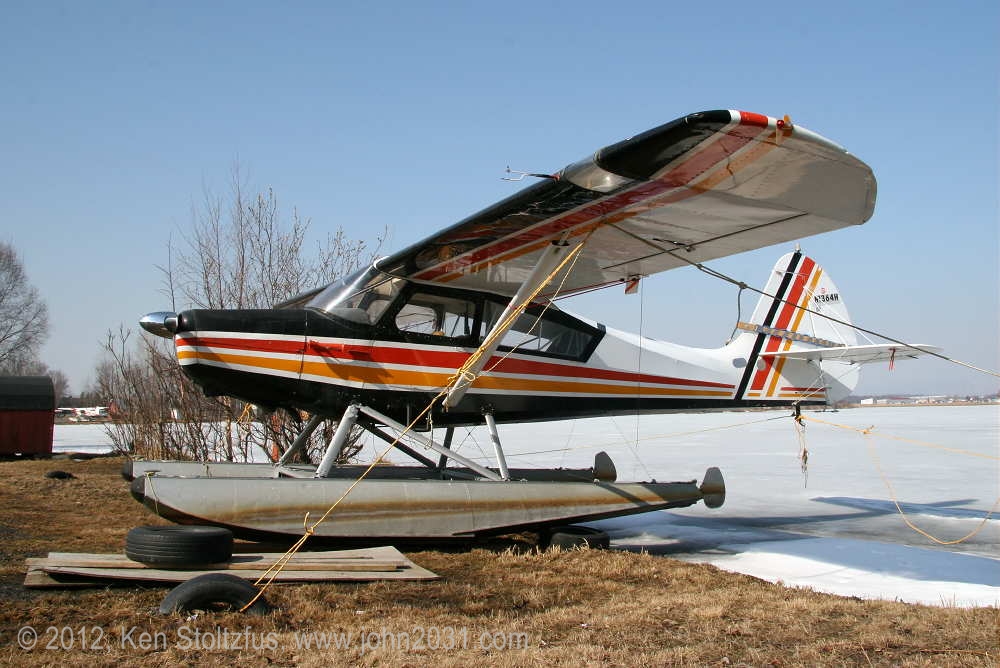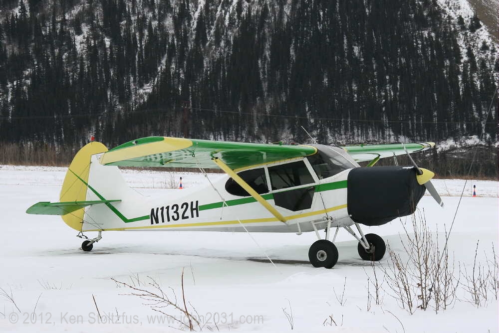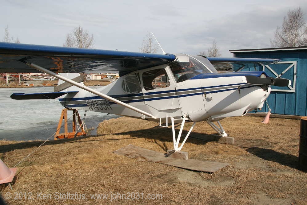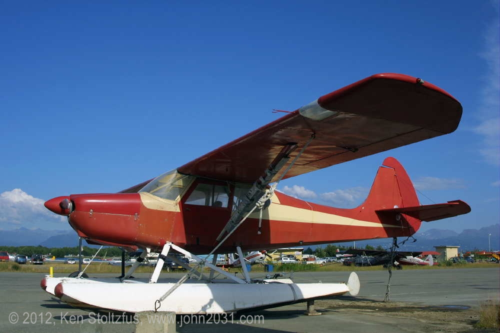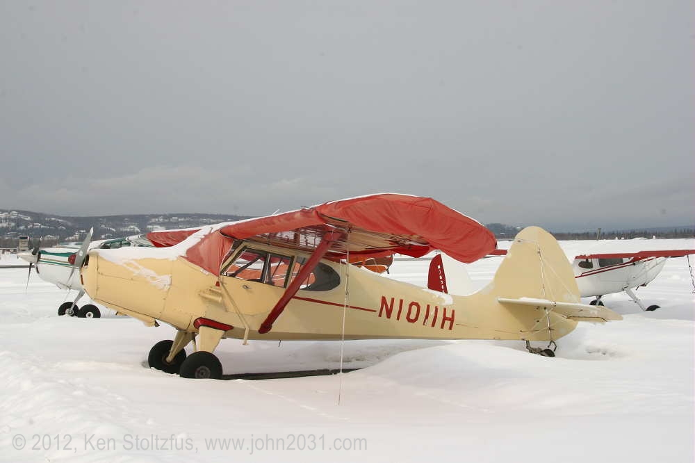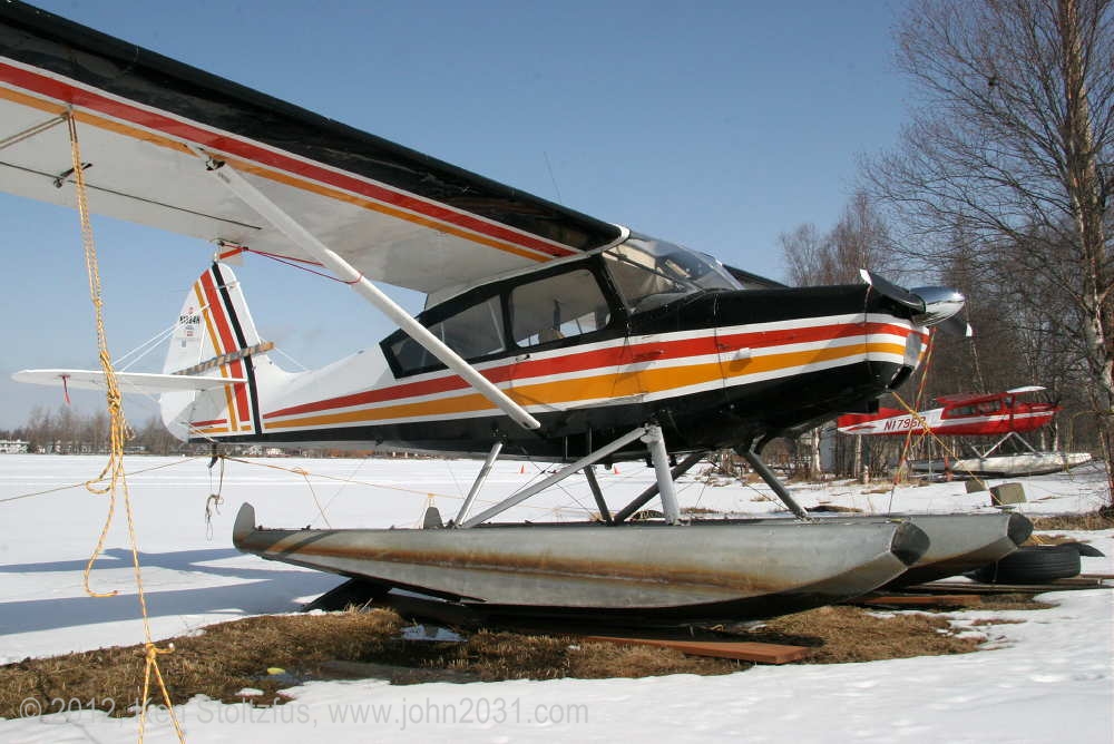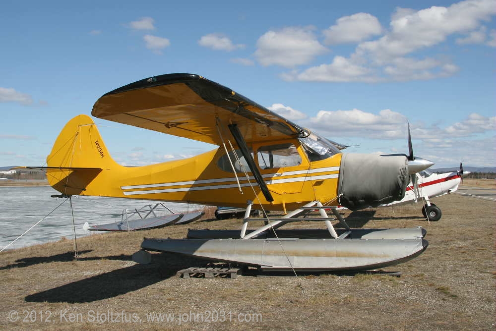 Another oldie, on the east ramp at PAFA, Fairbanks International, AK. I first saw 1948 15AC-13, N1011H in 4/08 sitting out in the cold with some friends. It was there again when I stopped by on a much fairer day in 5/10 . It's quite stock-looking except for the seaplane door on the pilot's side and a bit larger tires. |