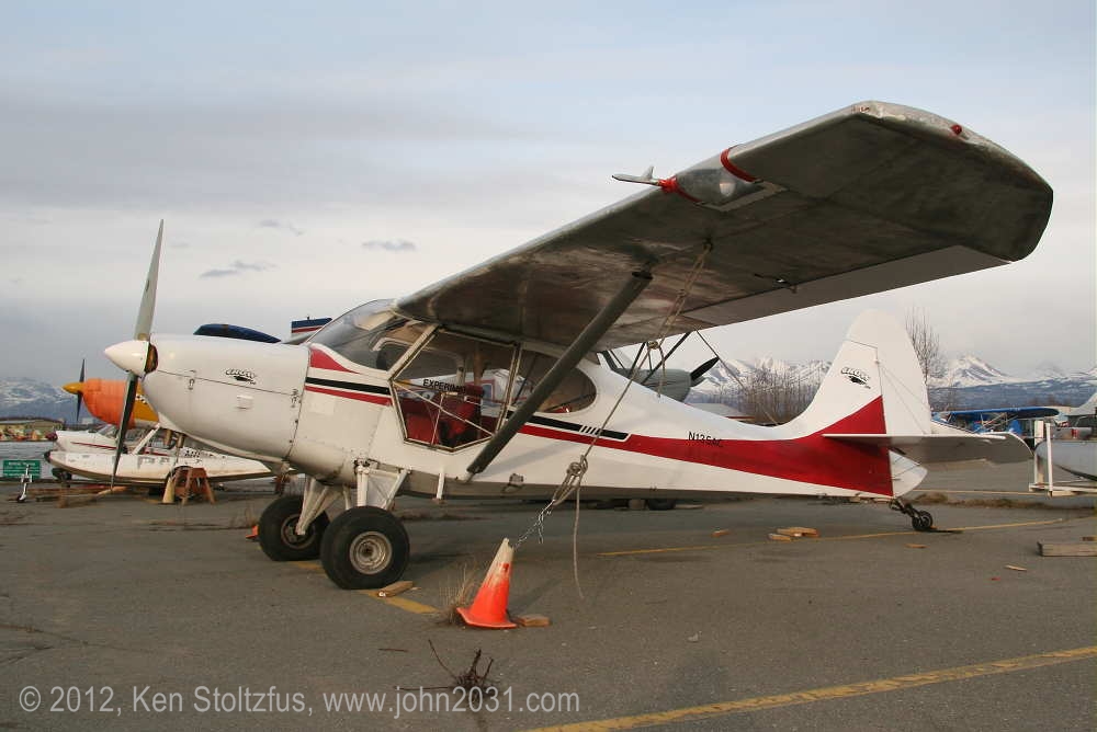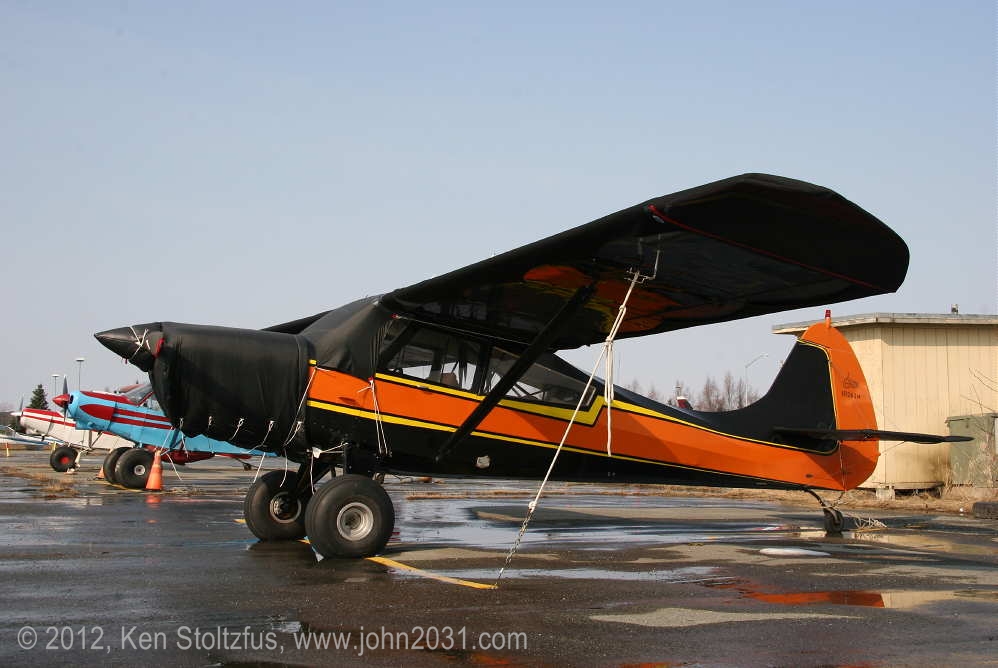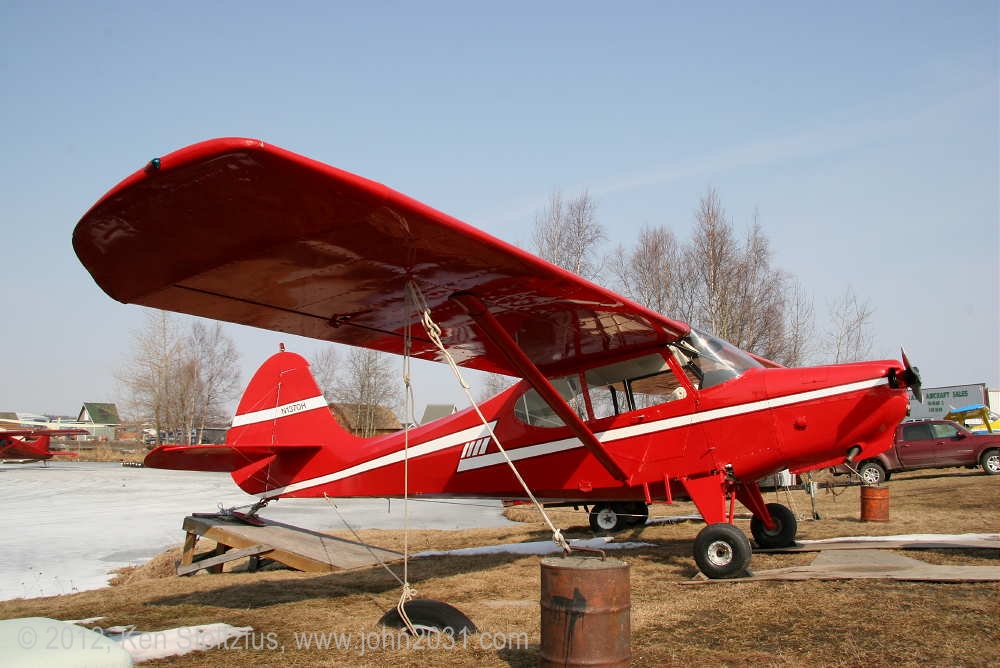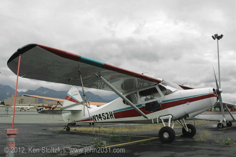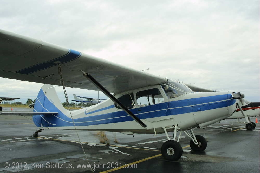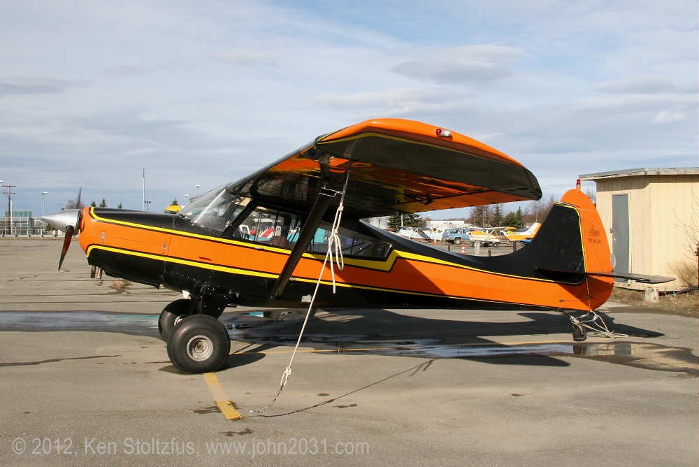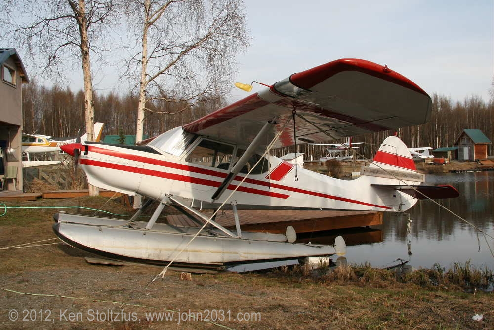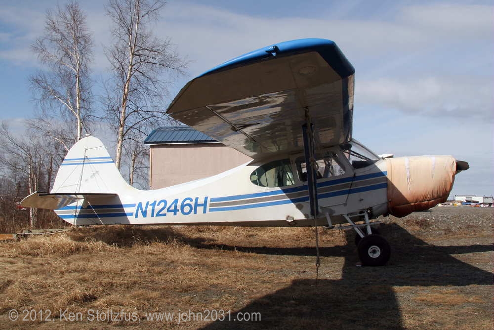 Another oldie, on the east ramp at PAFA, Fairbanks International, AK. I first saw 1948 15AC-13, N1011H in 4/08 sitting out in the cold with some friends. It was there again when I stopped by on a much fairer day in 5/10 . It's quite stock-looking except for the seaplane door on the pilot's side and a bit larger tires. |