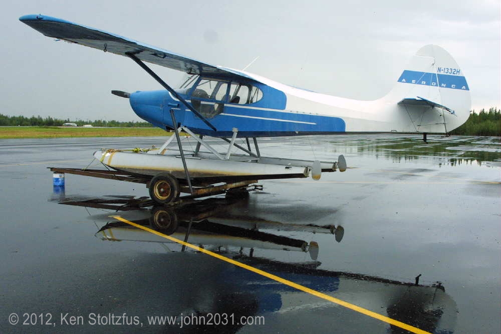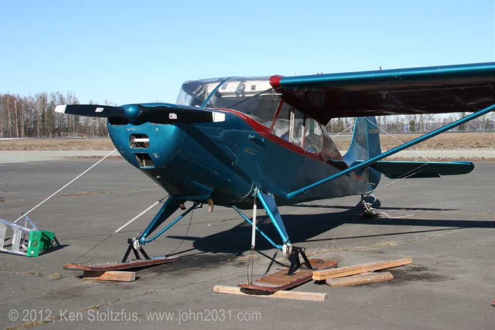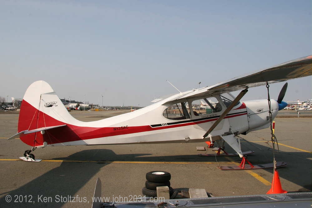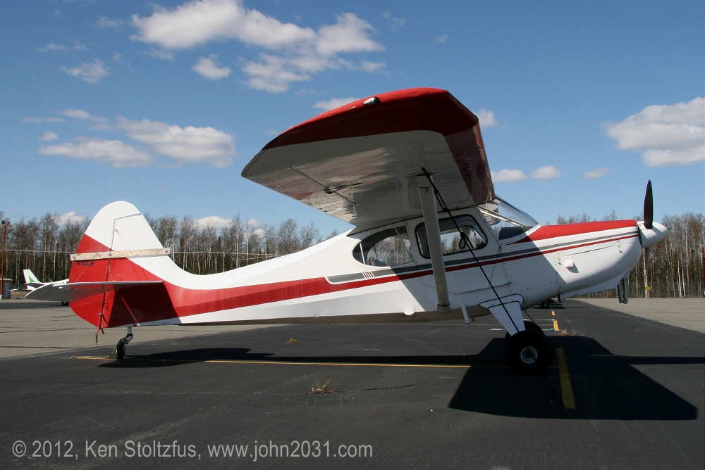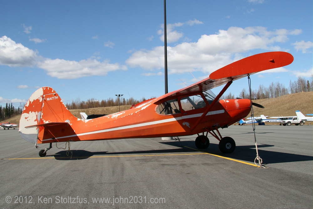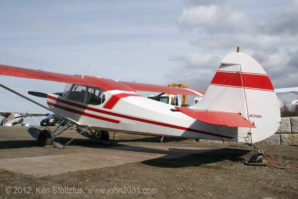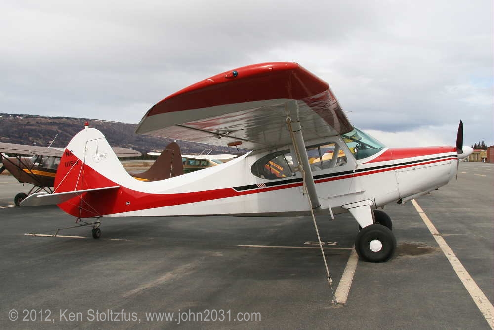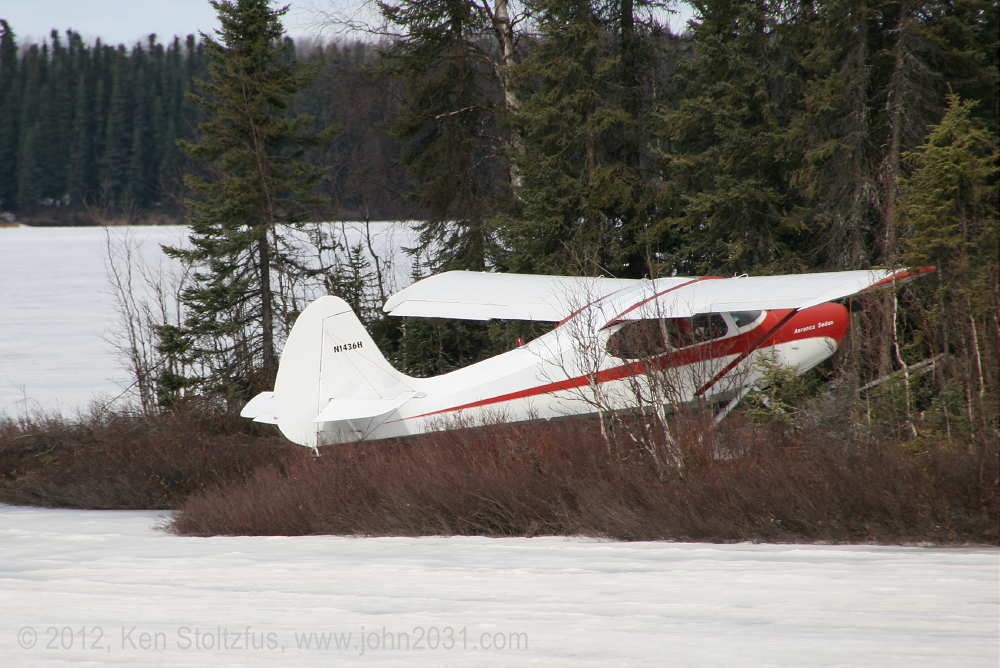 1949 Aeronca Sedan N1354N, 15AC-398, seemed a lot happier in 5/11 and 5/12 than it did with that one-armed look in 4/11. It's home is Birchwood Airport, PABV, AK. |