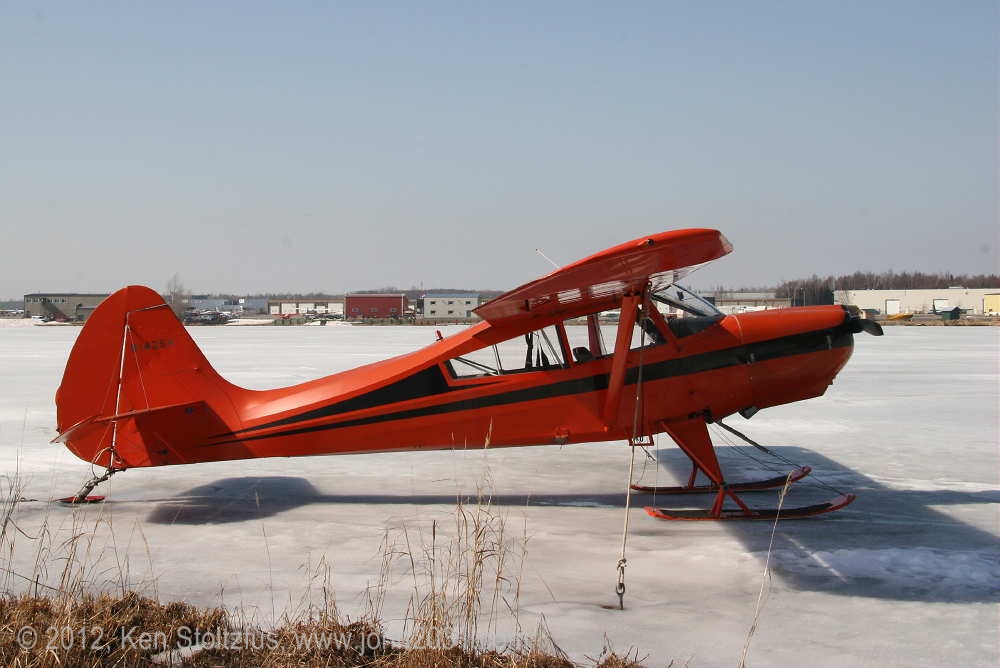 N1425H, 15AC-488 on Lake Hood in 4/08. Note that the tie-down anchors are screwed into the ice. I also captured it in morning light on the edge of Lake Hood in 5/12 and on a very gray day in 7/04. It is Lycoming O-360 powered.