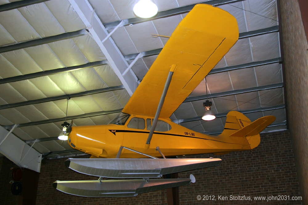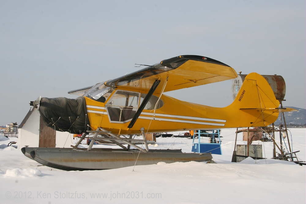 15AC-246, 1948 Aeronca 15AC Sedan, N1234H, at PAFA, Fairbanks, AK,. This is one pretty Sedan! It has the O-360 Lycoming with a modified Scout cowl, doors on both sides and Edo 2000's. The owner said the Sedans are a bit "under-floated" with the 2000's, especially with a moose aboard, but in general it is a delightful seaplane. It's easy to remember the numbers on this Sedan. Registration is 1234, and serial 246! The second two show it high and dry and waiting for spring! (Click on photos) |