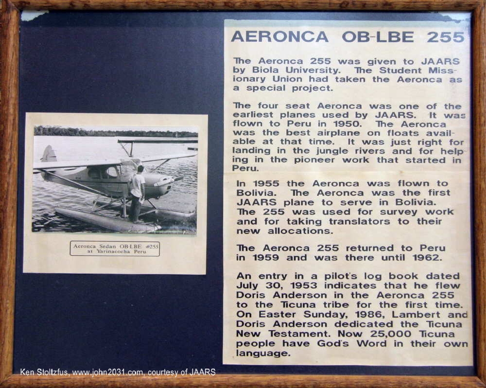 15AC-288, N1273H, Peruvian OBM-255, OB-LBE, served JAARS in Peru and Bolivia, 1950-62. See details on this plaque. It was rebuilt for display by Missionary Maintenance Services (now MMS Aviation) in Coshocton, OH, in the early 1980's, headed up by Jim Miller, long time JAARS mechanic and MMS founder. I was privileged to serve with MMS at the time. OB-LBE is now on display at the JAARS facility in Waxhaw, NC. |