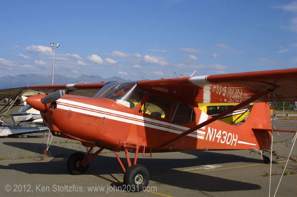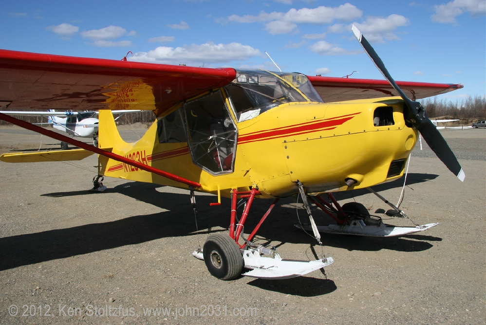 15AC-519, N1450H, basking in the sun on the ramp at PABV, Birchwood Airport, AK, 5/10. It has the Lycoming O-360, and note that the main wheel skies are off but the tail ski is still on. |
