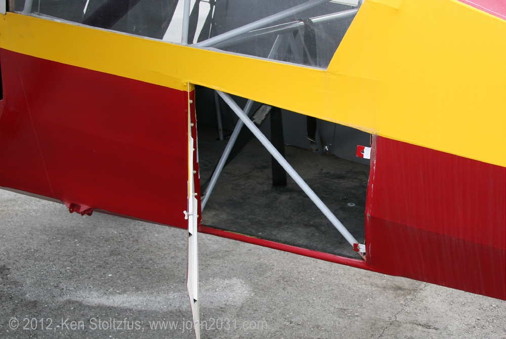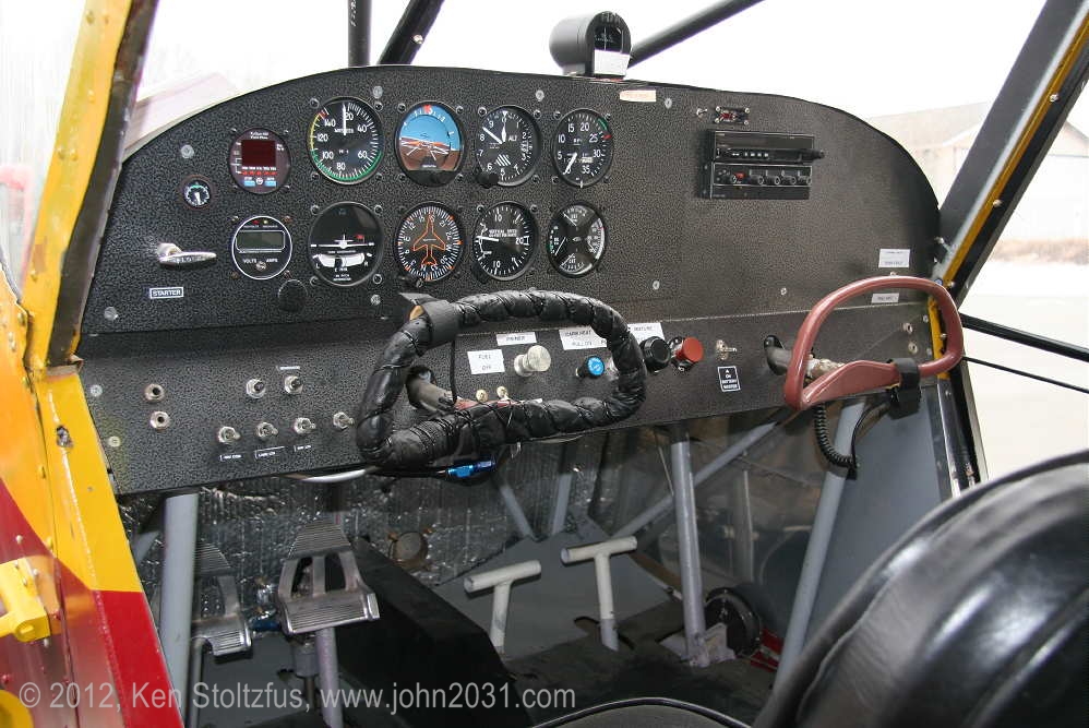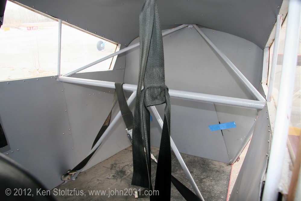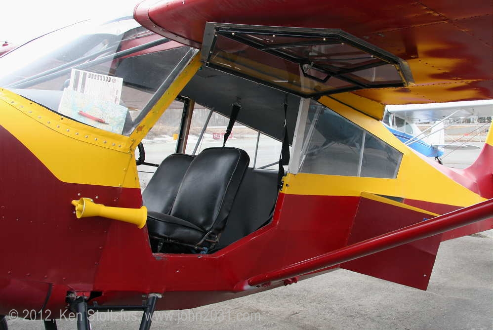 N159, 15AC-43, waiting for an engine. It was originally N1040H. As I recall, the owner said it was an unexpected failure after he had spent a lot of time on the airframe and thought he was good to go. Stuff happens! It has the added seaplane door and a nice panel. Looking into where the rear seat would be you can see the extended baggage area. That piece of structural tubing there is kind of in the way but the baggage door is still a useful addition. At Birchwood Airport, PABV, AK, 5/12. I also saw it at Big Lake in 5/10. My 1971 Canadian register shows it as CF-WYF, imported in 1968. |