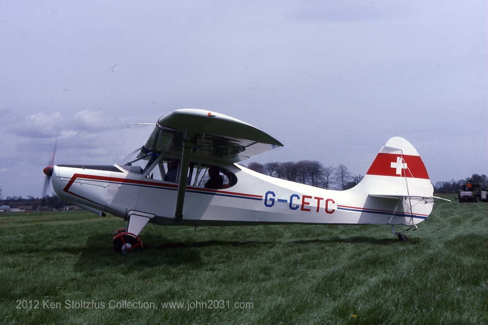 Aeronca Sedan G-CETC, 15AC-429, a 5/85 slide taken at Badminton in the UK. It went to England in 1983 and then to Ireland in 1993. It has been U.S. registered as N915TC since 8/99 but stayed in Ireland, I believe. Note the cool little wheel fenders! The Brits are very creative in the way they use their alphabetic registration system! |