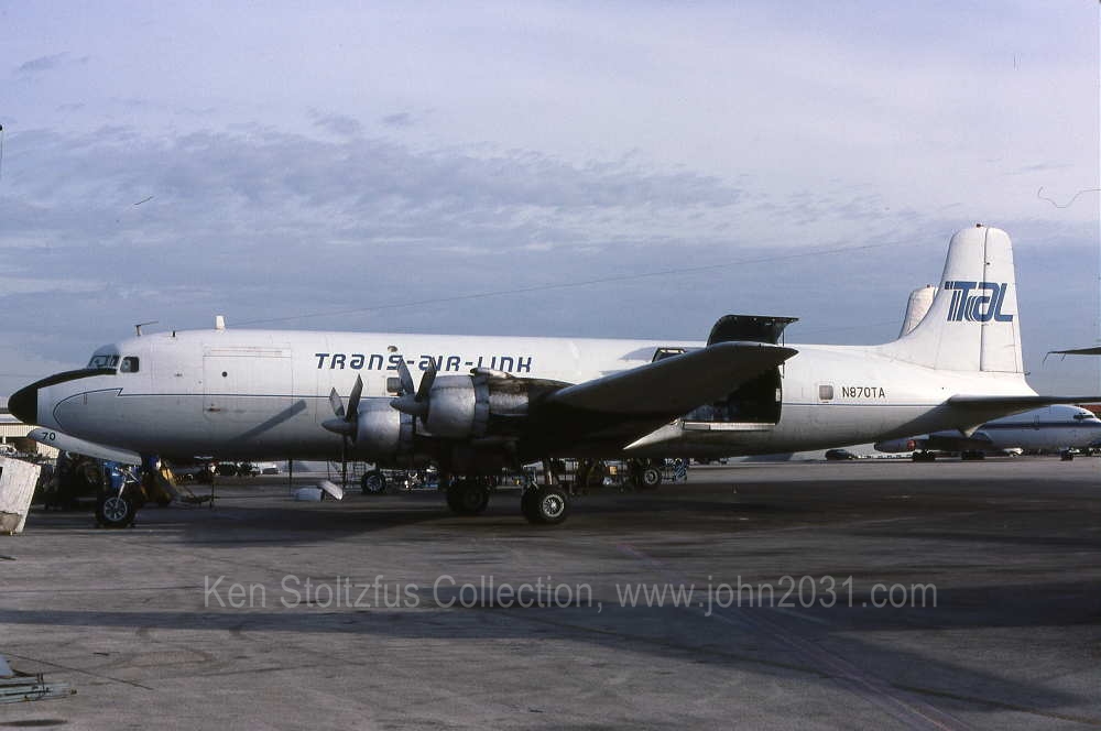 Douglas DC-6 N170UA, DC-6A cn 45518, 1958, Universal Airlines. Apparently built for Slick Airlines as N7820C, but not registered; to Belgian Air Force as KY-2 and OT-CDB; French F-BYCH for SFAir; Venezuelan YV-293C for Aero B, named "Maracaibo"; to N870TA for Trans-Air-Link, see 1/88 and 11/92 photos from slides; to N170UA for Universal. |