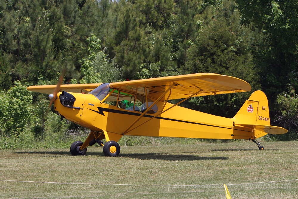 Piper J3C-65 N3644N, 1946, landing, and climbing out at MD18 Cambridge, MD 5-07. I saw it again in 5-11 at Gordonsville, VA, GVE. It's still the same owners (a husband and wife) and I want to tell you, we need to see this more often! Nice cockpit there! |