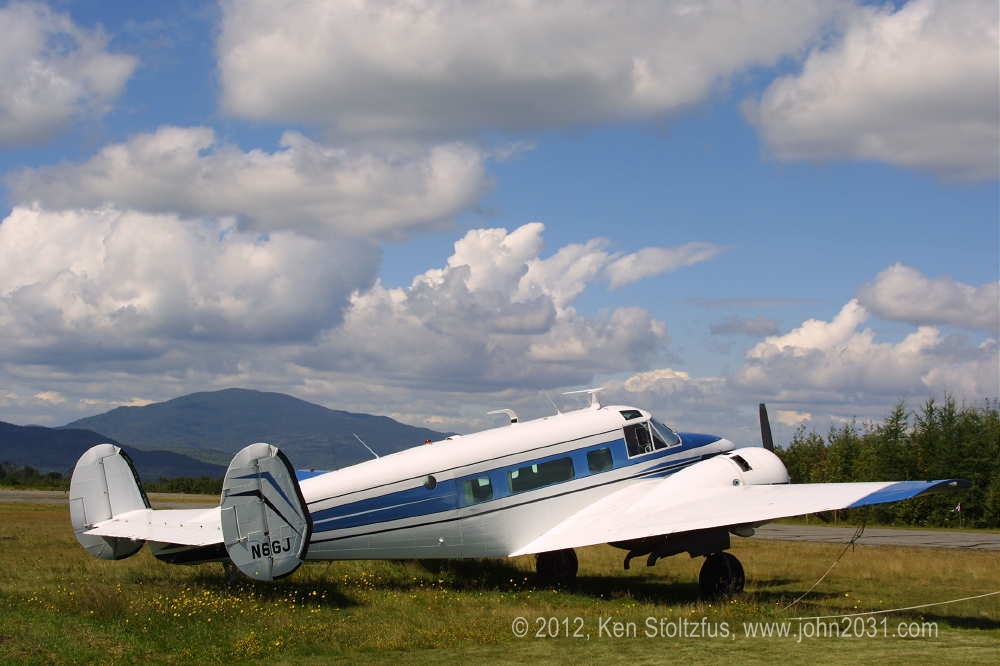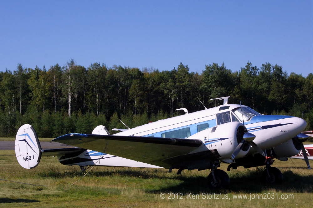 My wife Elaine and I were at the 2003 International Seaplane Fly-In and I captured this beautiful Super H-18 up at the airport, along with a lot of seaplanes down on the lake. It looks quite stock except for the larger, 11:00x12 wheels/tires as used on most earlier 18's. Golf Juliet is a pretty Beech, especially with that fall sky! |