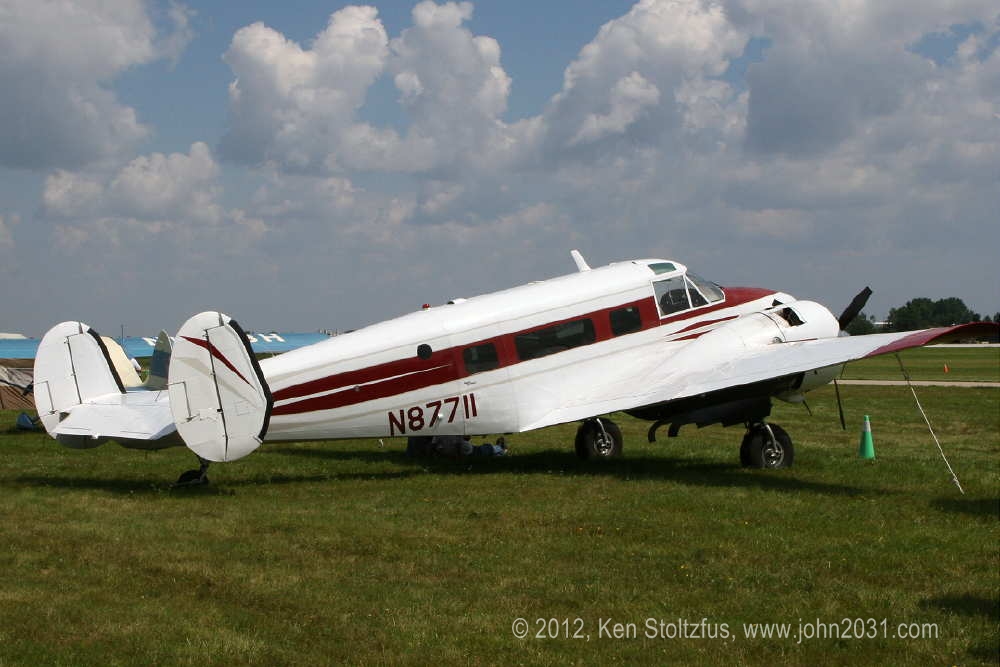 The H-18 was built with the smaller, 8:50x10 wheels/tires and Cleveland brakes in place of the 11:00x12, and the aircraft sat more level. Note the clamshell gear doors in those photos. Some operators converted their aircraft to the earlier main gears, i.e. as on the D, E and G-18's as part of a #10,100 gross weight kit. Yep, this is a pretty bird, from any angle! And here it is at Oshkosh 2010 as N87711. |