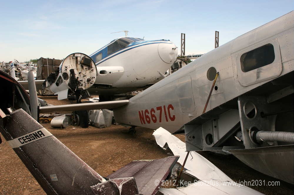 A clean looking old AT-11, N6671C looks quite complete and original. It'll probably never fly again but maybe someone will use the nose on another restoration. That's D-18S N328D looking over its shoulder. In 1963 it was registered to Rader and Associates, in Miami. |